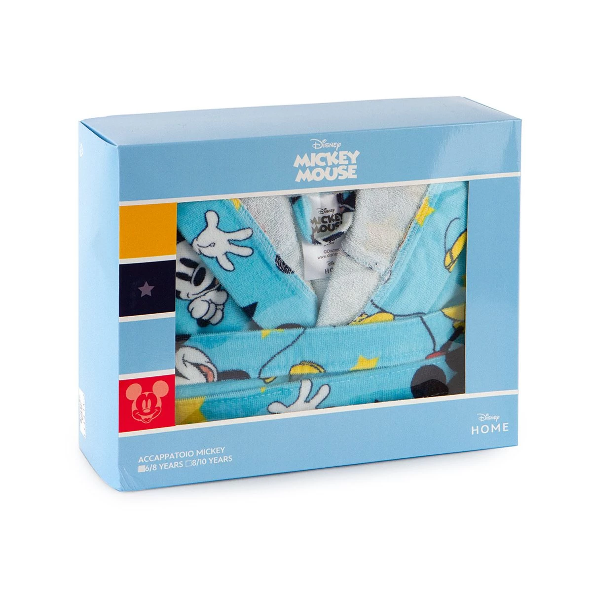 | Dettagli | La confezione comprende un accappatoio per bambino con cappuccio Dotato di due tasche laterali e cinturino Interno in spugna a riccio di puro cotone pettinato Esterno in ciniglia velour pettinato Stampa di Topolino Soffice e superassorbente Confezionato in una scatola stampata |